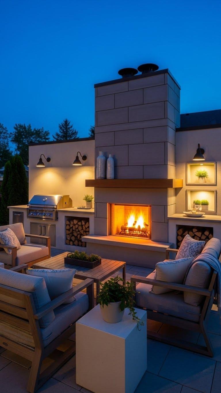 Moving your warmth outside lets you extend cozy evenings into the open air with a dedicated patio fireplace feature that reads like outdoor living room architecture.