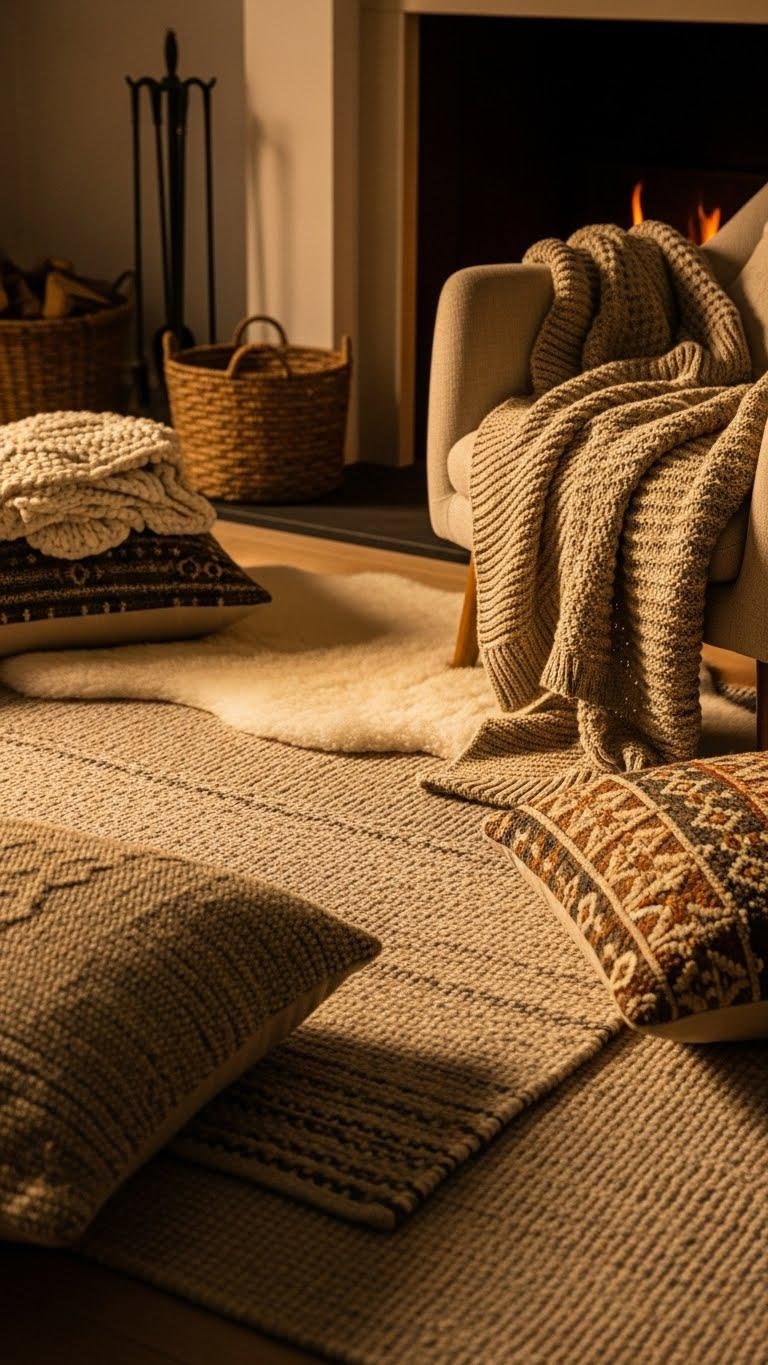 Layering textiles around your hearth instantly softens the room and defines a welcoming zone for lingering—start by anchoring the space with a low-pile rug in a neutral tone, then add a smaller textured rug or sheepskin for contrast and tactile depth.