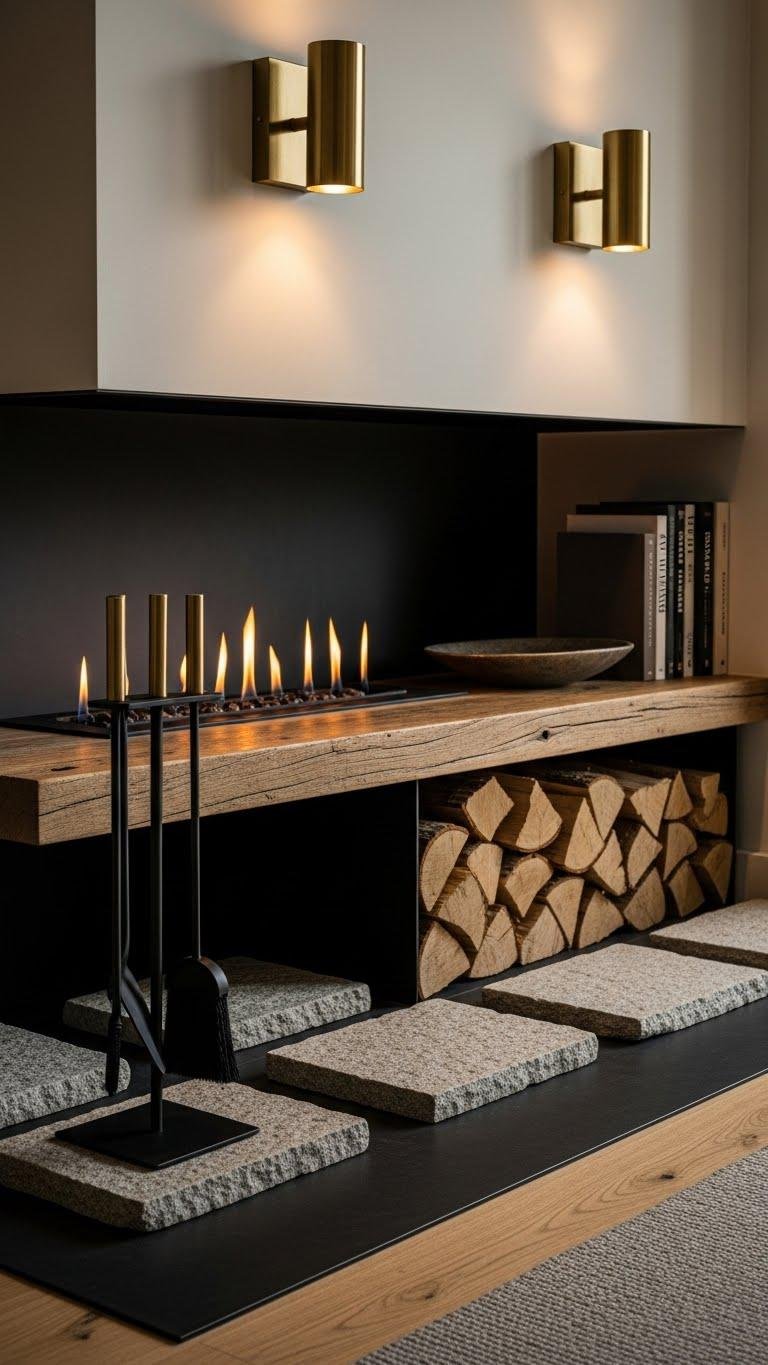 Layer minimal stone pads beneath logs, add sculptural metal decor, and keep lines clean so your fireplace reads adventurous, refined, and effortlessly free.