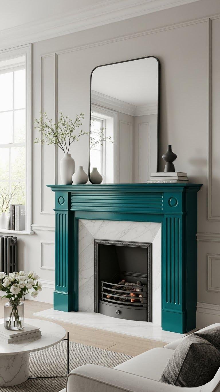 Marble offers quiet luxury, but sometimes you’ll want the mantel to act as a focal exclamation rather than a subtle backdrop—painting it a bold color is the quickest way to create that graphic contrast.