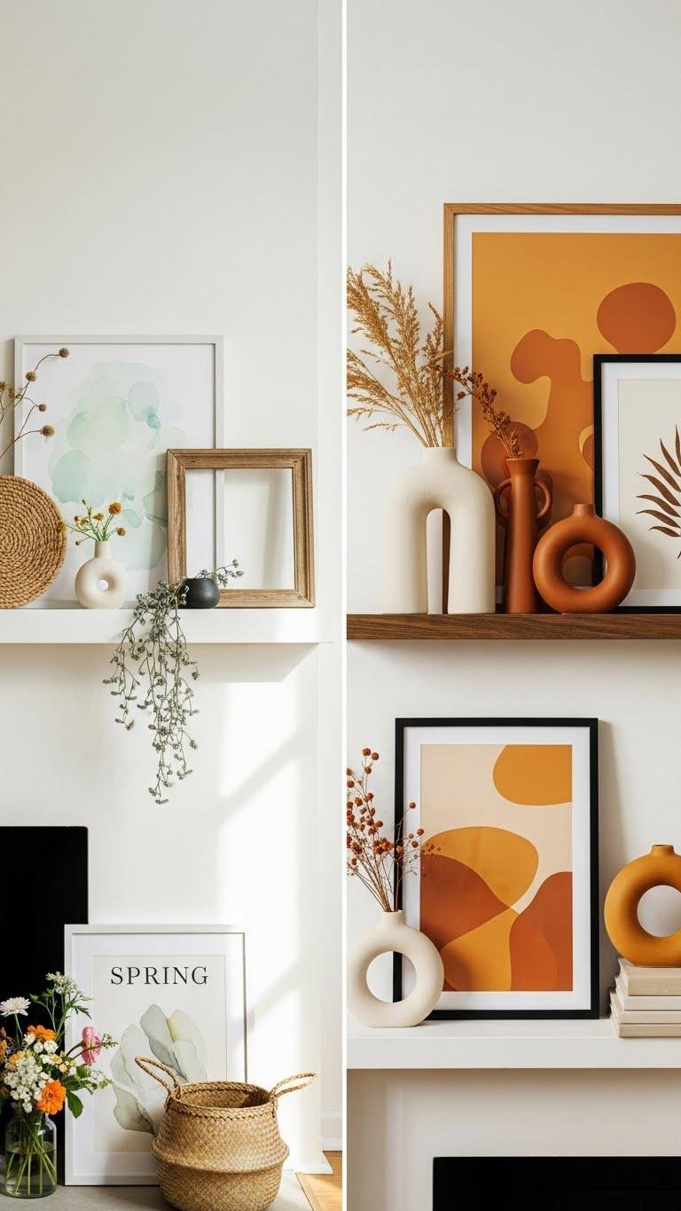 When the seasons shift, refresh your mantel by layering artwork and objects that echo the mood — swap in a breezy watercolor and a woven basket for spring, trade them for amber-toned prints and sculptural ceramics in autumn. You’ll curate rotating artwork and tactile seasonal objects, mixing scale, frame finishes, and negative space so your fireplace feels effortless, expressive, and ready for spontaneous change.