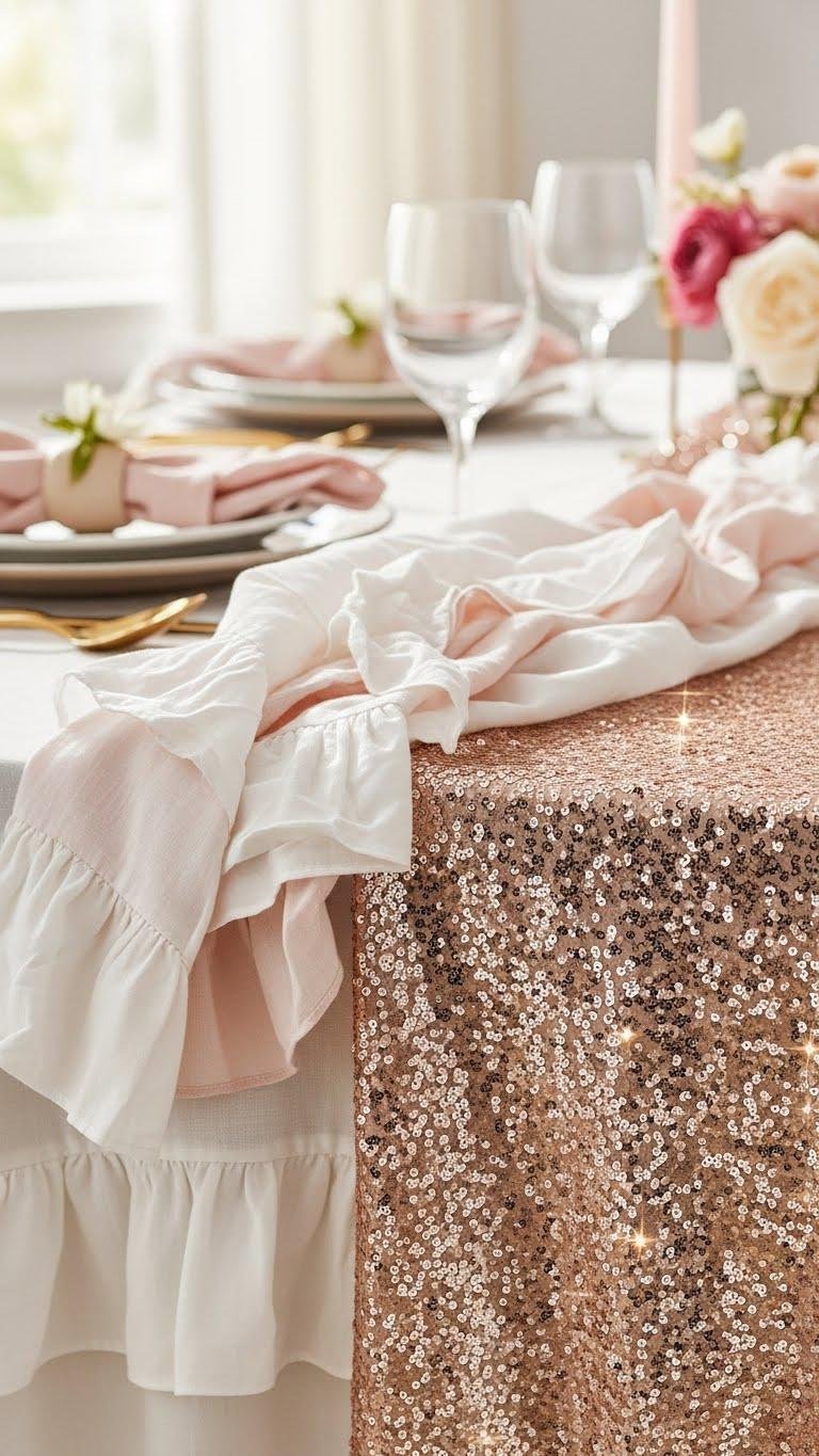 You’ll mix ruffled textures with bold sequin layering for contrast — think soft cotton ruffles under a glimmering runner.