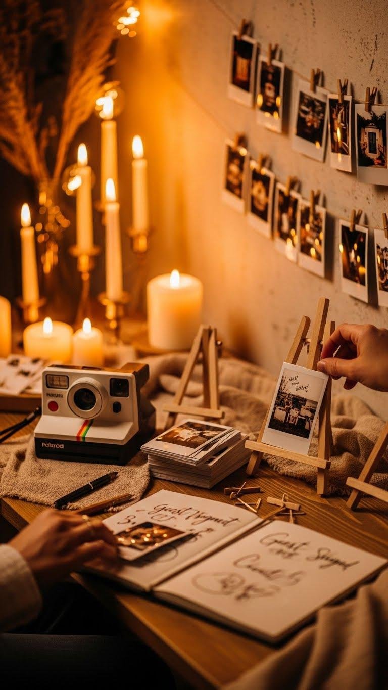 After the warm glow of clustered candles settles, bring the same cozy, camera-ready energy to a Polaroid station where guests can capture the night in tangible moments. You’ll set rules for instant camera etiquette — like one shot per person and quick queues — then offer chic print display ideas: string clips, mini easels, a guest-signed photo book for freewheeling memories.