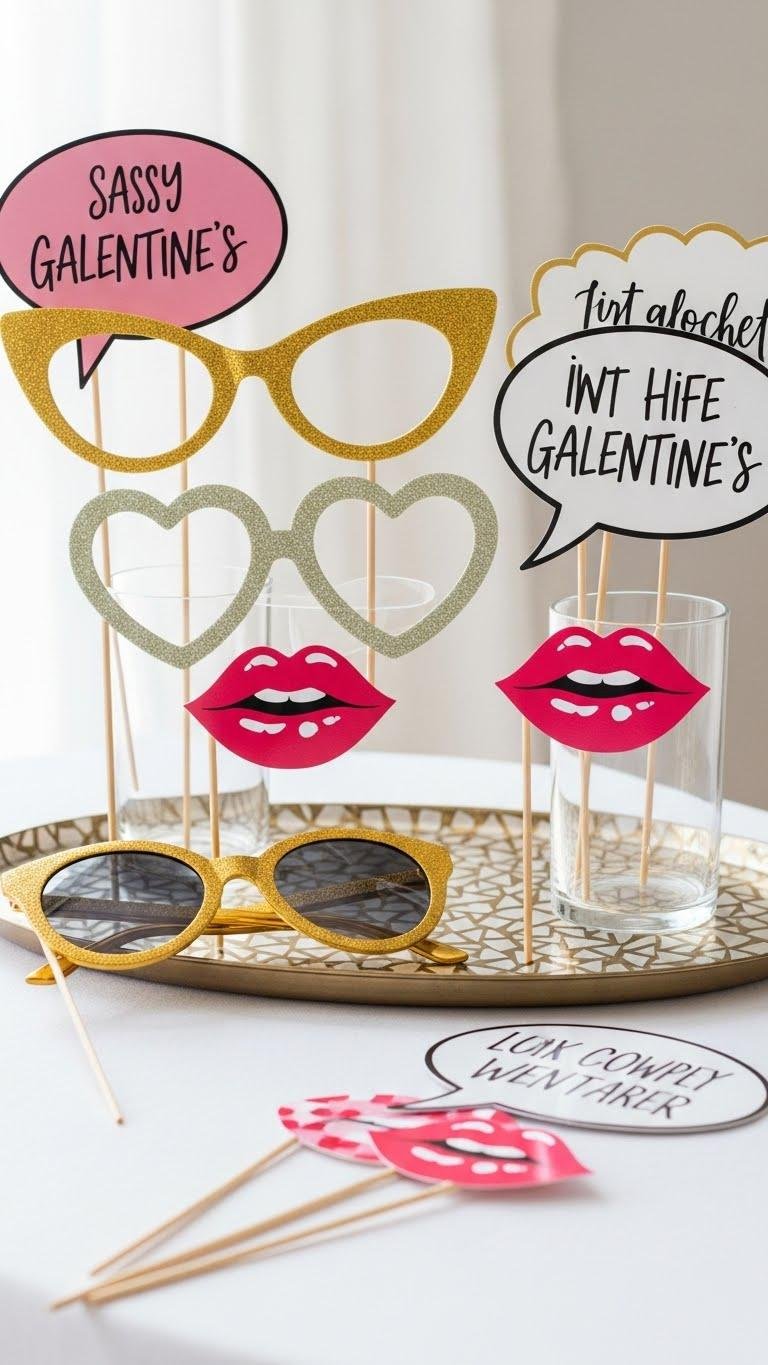 Kick things up a notch with a DIY photo-booth props kit that’s equal parts playful and chic—think oversized cat-eye glasses, glittery heart frames, and hand-lettered speech bubbles with sassy Galentine’s one-liners. You’ll mix Retro sunglasses with metallic sticks, bold lips, and Slogan bubbles that shout freedom. Arrange on a tray, add a backdrop, and let everyone strike unapologetic, camera-ready poses.