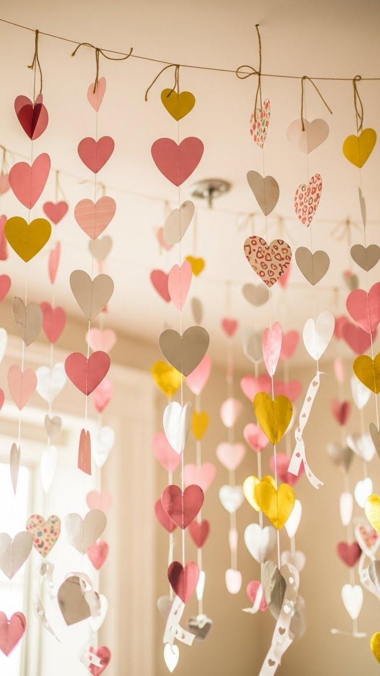 Hanging paper heart chains across the ceiling instantly turns a room into a playful, romantic canopy you and your friends will want to selfie under—choose ombré pinks, metallics, or mixed patterns to match your theme.