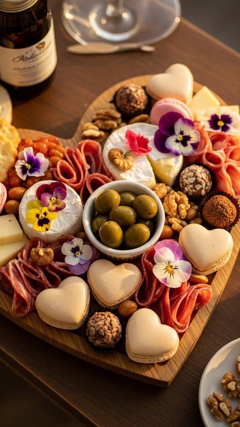 Heart-shaped boards are a playful, instantly Instagrammable way to center your spread and set a romantic, celebratory tone. Arrange mini charcuterie portions—cheeses, cured meats, olives—around edible florals and nuts, then add dessert hearts like macarons and chocolate truffles for contrast. You’ll craft a bold, free-spirited display that photographs beautifully and invites guests to graze, mix flavors, and savor the moment.
