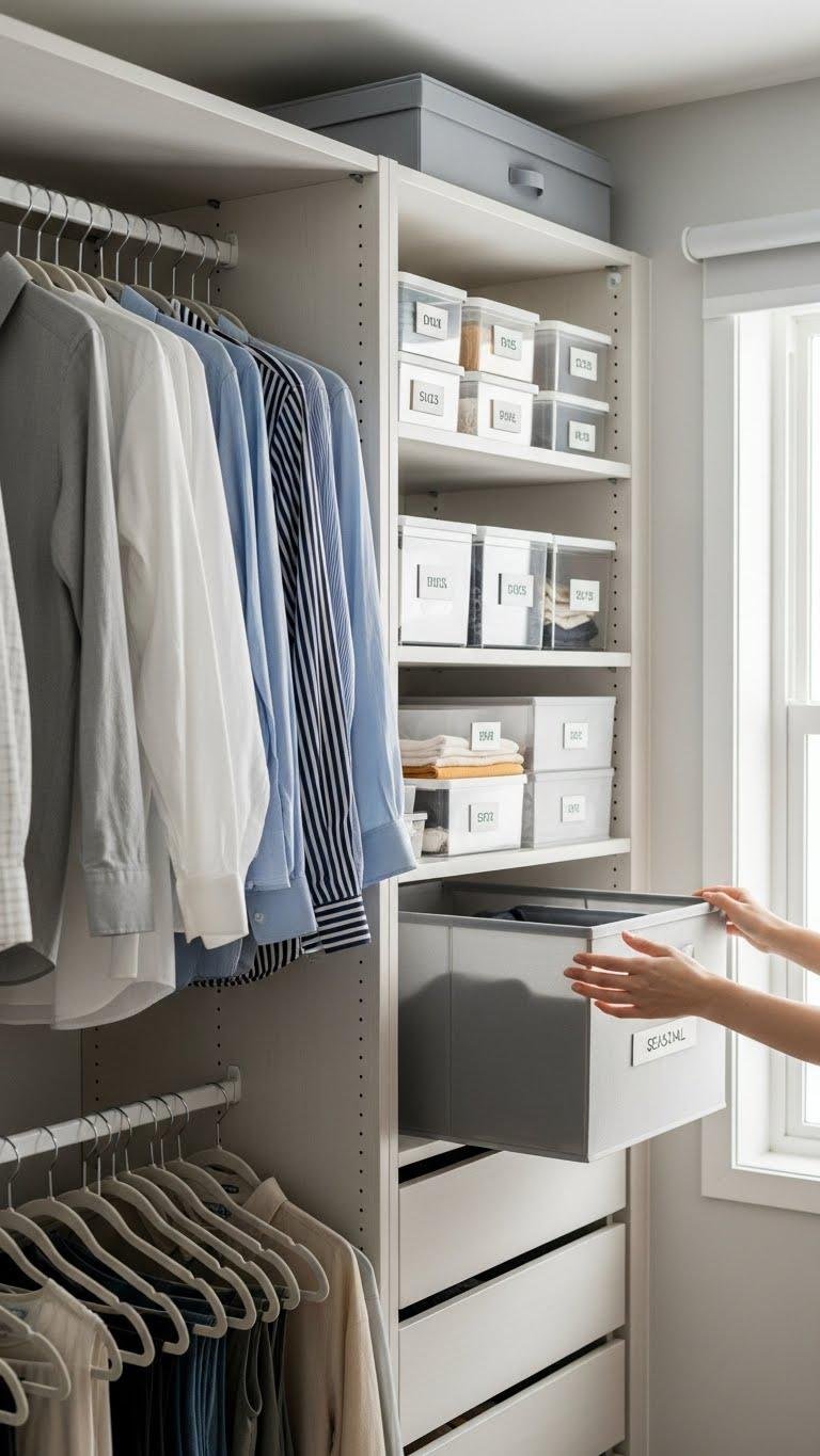 Tackle clutter by swapping mismatched bins and hangers for a cohesive set of storage pieces—matching boxes, slim hangers, and clear labeled containers instantly tidy visual noise and make everything easier to find.