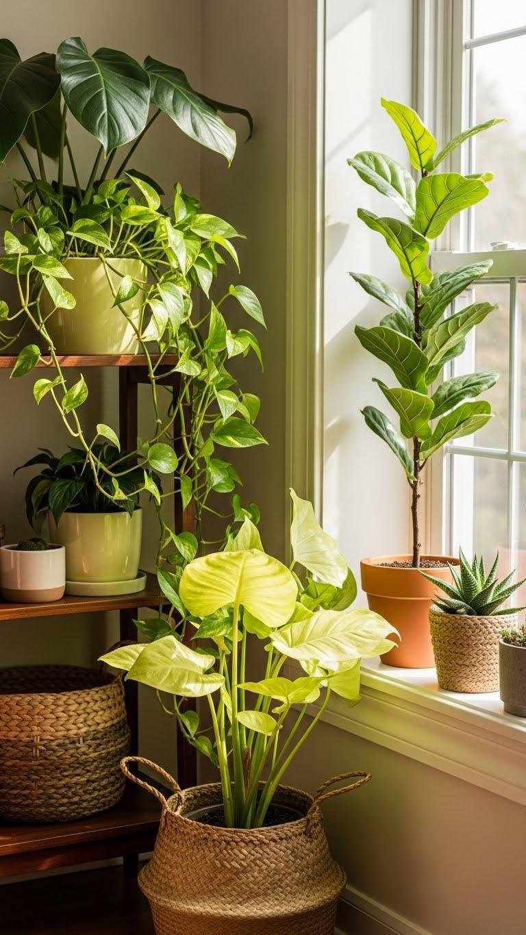 Often, you’ll find that a few well-placed plants instantly lift a room’s mood and texture—think trailing pothos on a shelf, a sculptural fiddle-leaf fig by a sunny window, or a cluster of succulents on a windowsill. Mix low light plants with statement specimens for contrast, choose air purifying greenery for healthier interiors, and arrange varied heights to create a relaxed, free vibe that feels intentional.