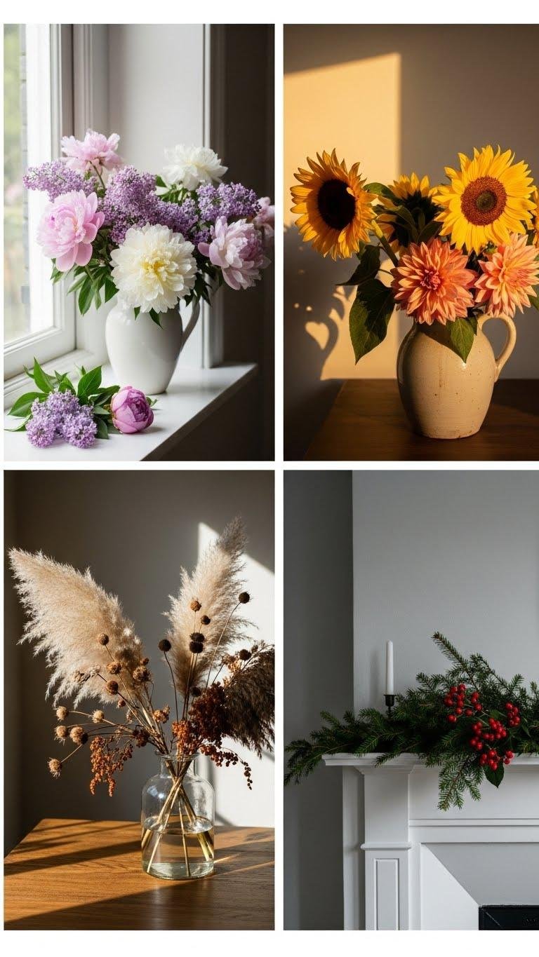 Seasonally rotating flowers and botanicals instantly refresh a room’s palette and energy, so pick stems that reflect the moment—peonies and lilacs in spring, sunflowers and dahlias in summer, pampas and seedheads in fall, and evergreen sprigs with berries in winter. You’ll craft seasonal centerpieces and botanical wreaths that feel effortless and personal, mixing wild stems, bold hues, and airy silhouettes to free your space.