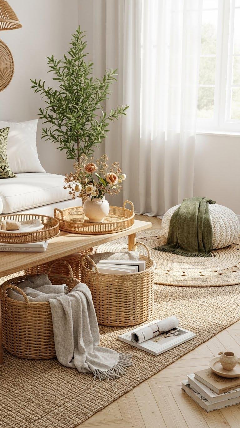 Let woven baskets corral throws and magazines, while jute rugs anchor seating zones. You’ll create a calm, airy vibe that feels curated yet effortless, inviting movement and relaxed living.