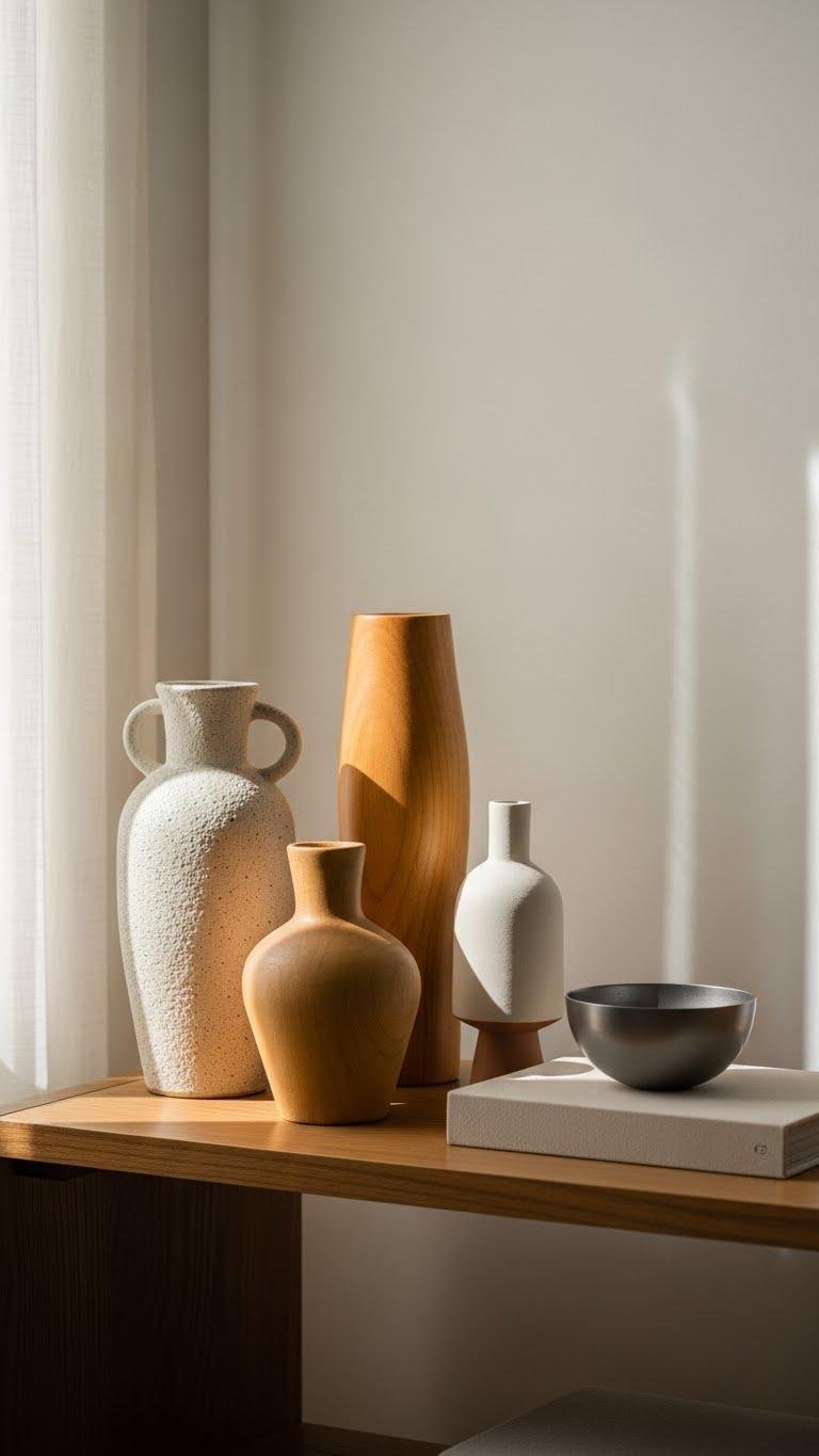 You’ll arrange an asymmetrical trio or five with varied heights, using textural contrast—ceramic, wood, metal—to guide the gaze.