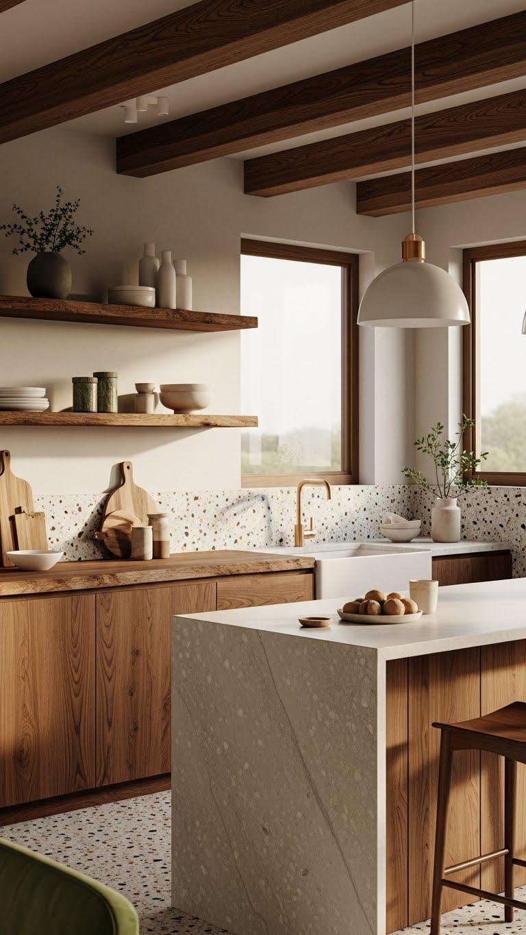 Choose live edge shelving, reclaimed beams for structural character, and soapstone countertops for durable warmth.