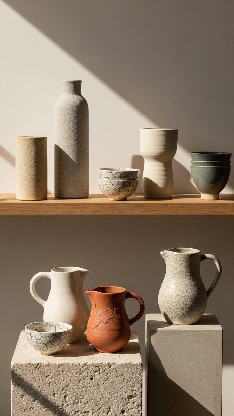 Introduce sculptural accessories and pottery as the quiet protagonists of a room: they anchor spaces with form, texture, and history without shouting for attention.