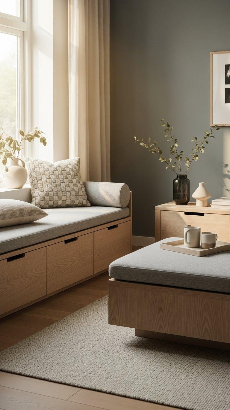 Pull a bench into your layout to anchor circulation and add quiet utility—bench seating and multifunctional furniture do heavy lifting without drawing attention. Choose a window bench for lounging and hidden drawers, or a streamlined storage ottoman for spare seating and concealed clutter. You’ll create flexible zones that read calm and intentional, giving you freedom to rearrange, store, and simplify daily living.