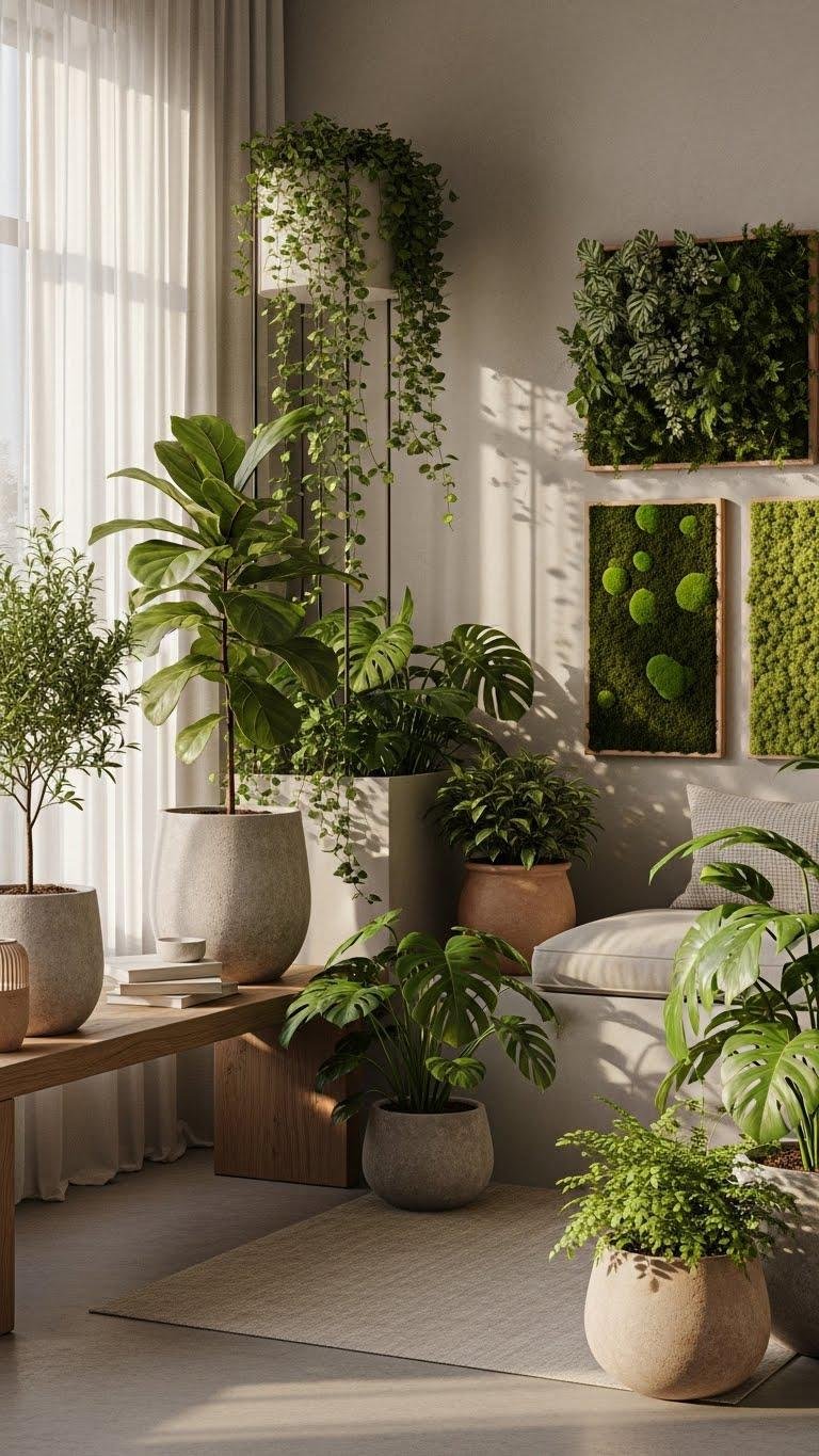 You’ll curate layers: sculptural potted specimens, trailing vines, a compact living wall for vertical drama, and tactile moss art for quiet contrast.