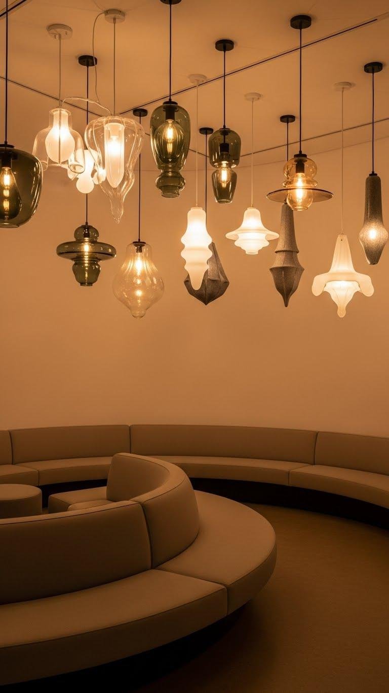 Curved seating invites a softer silhouette at eye level, and you can amplify that sculptural language overhead with statement pendants and chandeliers that read like wearable art. Choose hand blown glass pieces and kinetic fixtures to introduce motion and personality. Opt for acoustic friendly pendants where echo matters. You’ll curate a liberated, gallery-like room that balances form, function, and atmospheric light.