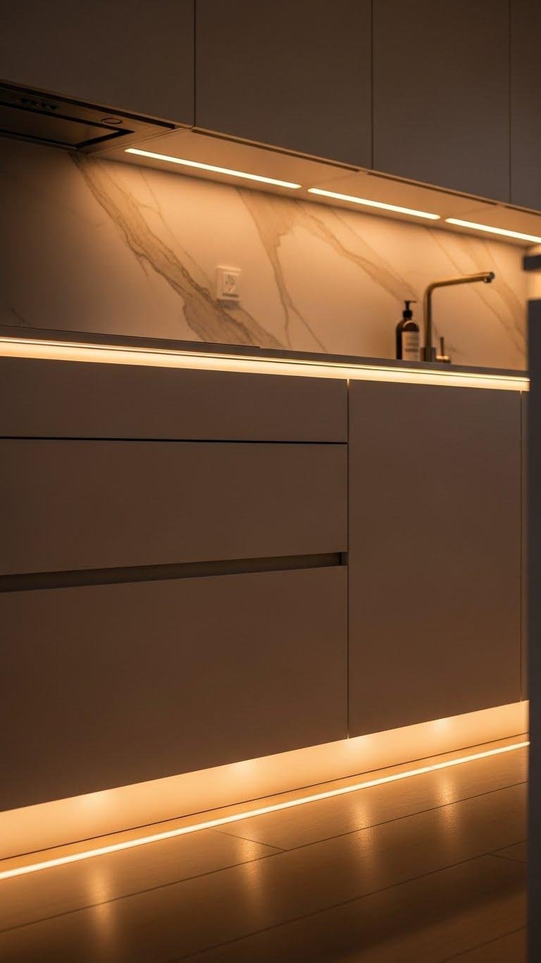 Brighten up low-visibility zones and add a subtle design cue with under-cabinet and toe-kick LED accents that quietly elevate a room’s layered lighting. You’ll use recessed profiles and slim under cabinet strips to keep lines clean.