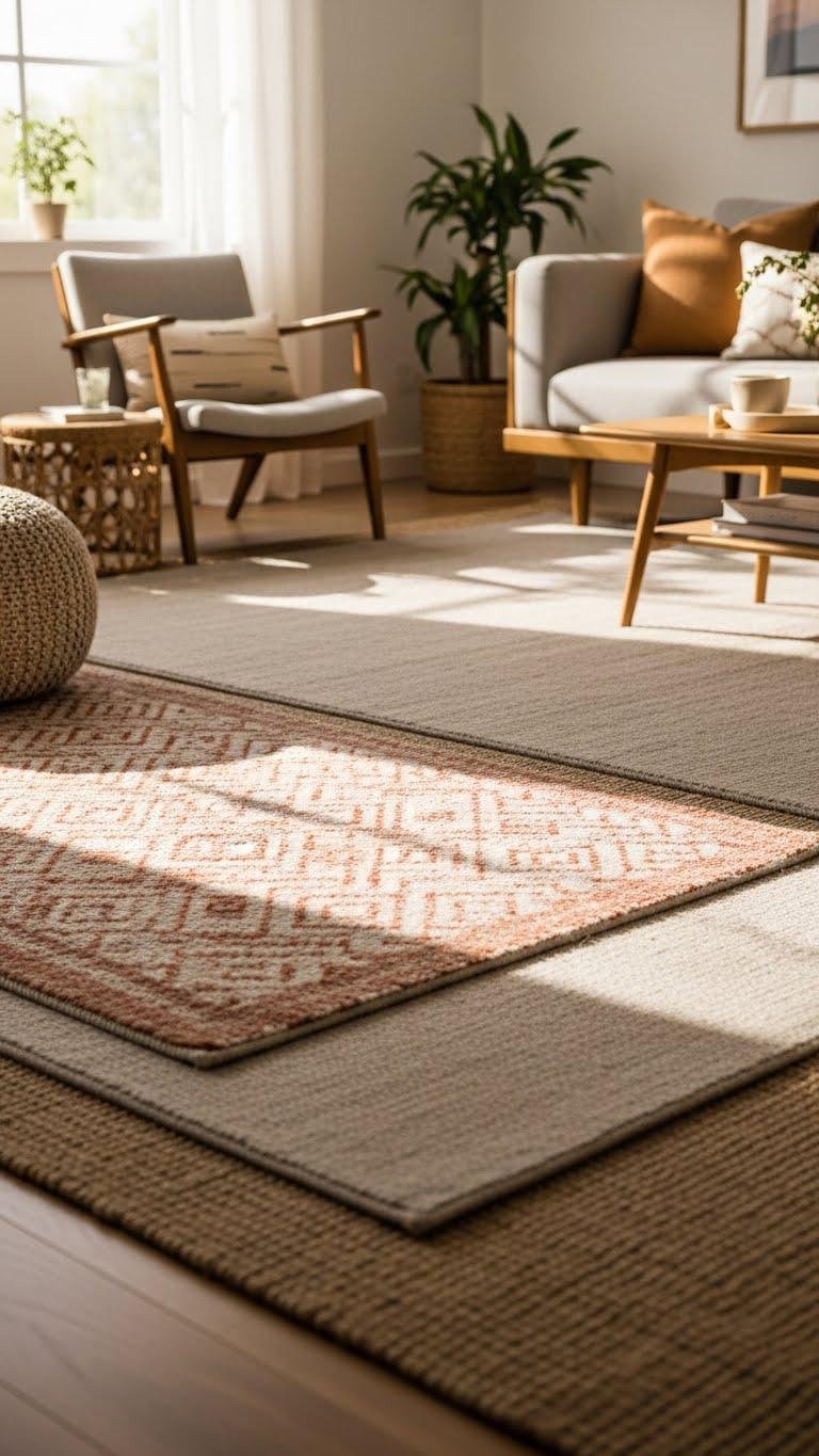 Layer rugs to carve out purpose and soften hard edges—start by placing a large, neutral base layer that anchors the room, then overlay a smaller, textured or patterned rug to signal a specific zone like seating or reading. You’ll use a jute underlay for grip and warmth, embrace pattern mixing with restraint, and adjust scale so each layer reads intentional and free.