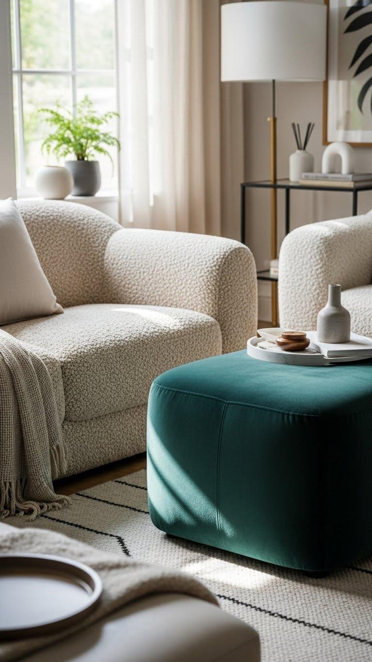 Choose bouclé sofas for relaxed sculptural comfort and pair velvet ottomans as luxe accents; mix neutral tones with bold jewel pieces for liberated, curated spaces.