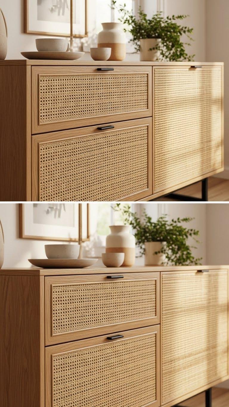Start by letting woven cabinet fronts and rattan accents soften hard modern lines—these tactile weaves introduce warmth, texture, and a handcrafted note that reads both timeless and contemporary.