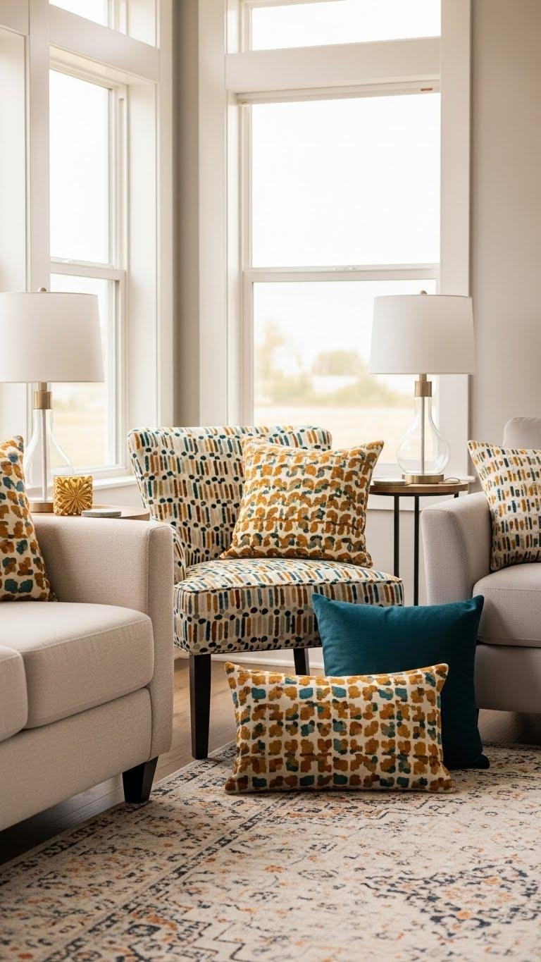 Often, you’ll want bold patterns to punctuate a room rather than dominate it: reserve them for pillows, a single upholstered chair, a rug, or an accent wall so the eye has clear resting points and the room reads composed.
