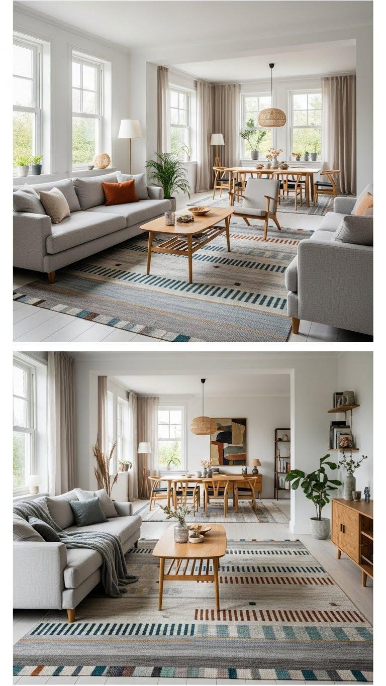 Across connected rooms, a shared rug palette grounds the flow and gives your home an instant sense of cohesion. Use muted repeats and accent contrasts to create subtle color anchoring so spaces read as one. You’ll define areas without walls through intentional rug zoning, picking textures and scale that echo across rooms.