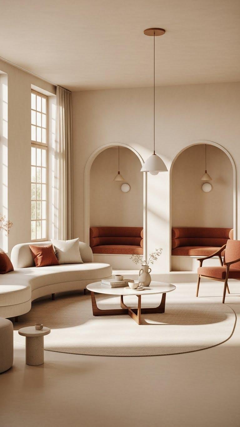 How do repeating shapes and soft curves change how a room feels? You’ll amplify flow and calm by choosing rounded silhouettes in sofas, tables, and alcoves.