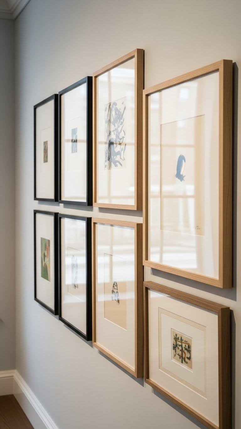 Because a consistent frame lets disparate pieces read as a single composition, choose a unifying framing strategy before you hang anything. Pick a finish and mat depth, decide matte vs glossy glazing, and keep consistent edge thickness.