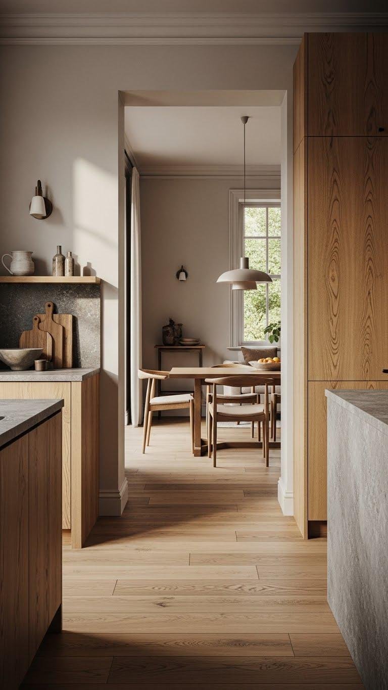 With a calm neutral base in place, repeat a handful of key materials—like warm oak and matte stone—to knit rooms together and give your scheme a tactile through-line.