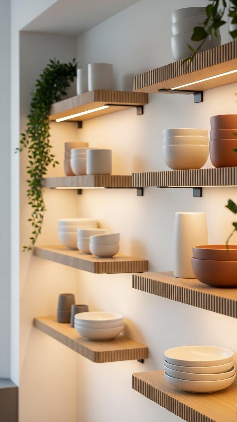 You’ll favor narrow shelving mounted with minimalist brackets, arranging curated ceramics with breathing room.
