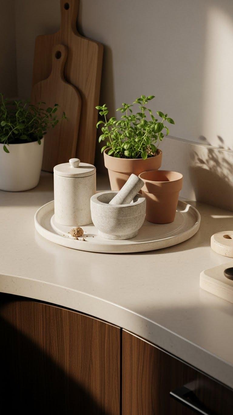 Against a backdrop of soft radiused counters, place a few purposeful items to craft calm, useful vignettes that read like curated still lifes. You’ll group an artisan saltcellar, a compact mortar, and seasonal herbpots near prep zones, keeping lines clear and reach easy. Choose muted textures, one sculptural tray, and only what you use — freedom through restraint.