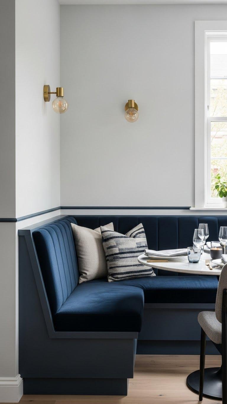 Contrast anchors a room, and a deep navy breakfast nook does that work with quiet confidence.