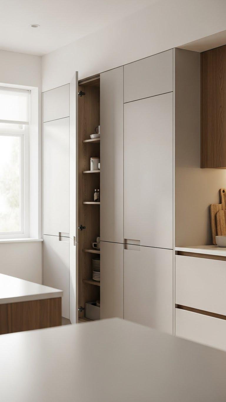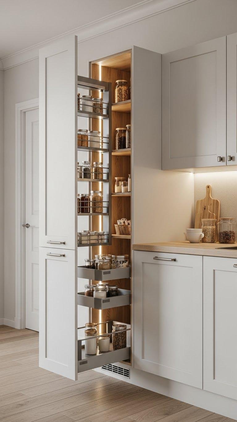 Slide a slim pull-out pantry into your cabinet run and reclaim wasted depth without breaking the room’s clean lines.