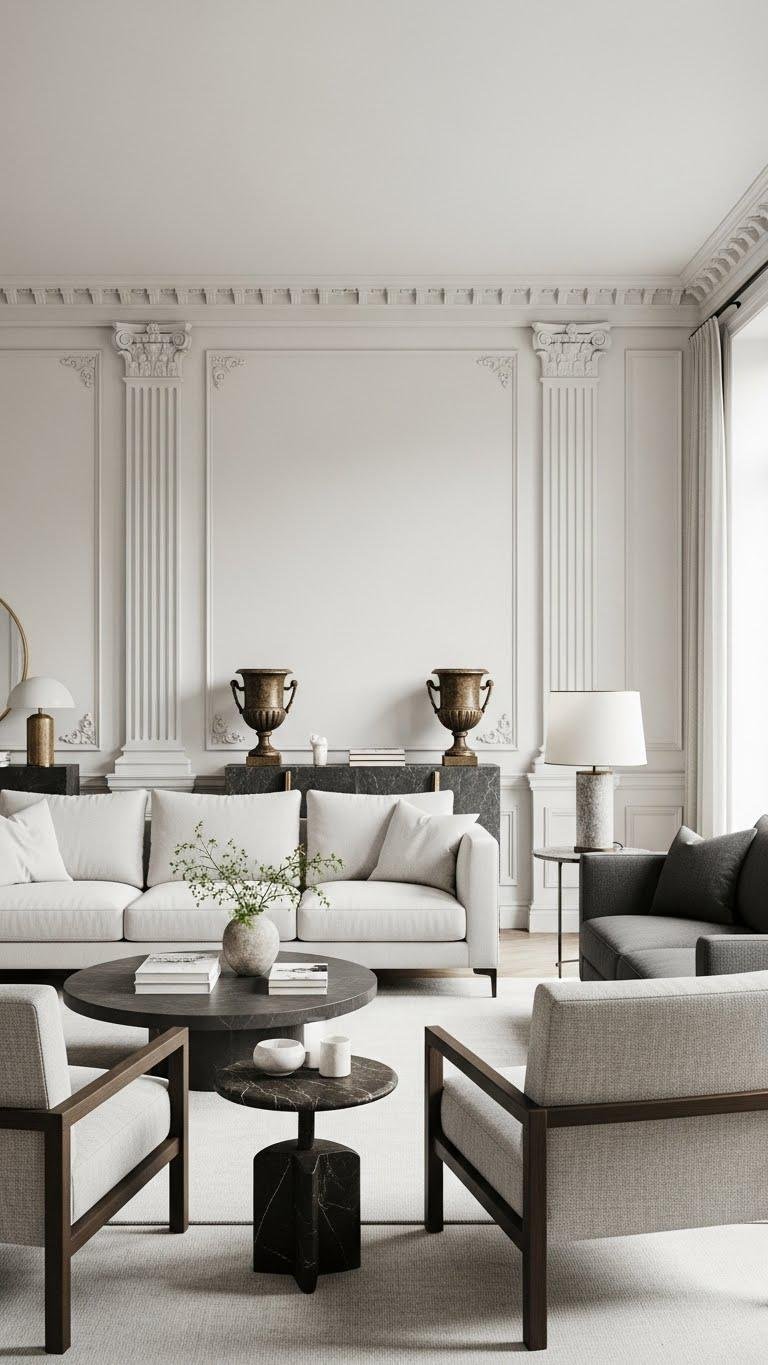 If you want a living room that feels both timeless and fresh, layer neo-classical motifs—think fluted pilasters, delicate moldings, and urn-like silhouettes—onto furniture with clean, modern proportions. You’ll balance classical moldings with streamlined silhouettes, choosing restrained color, airy spacing, and tactile fabrics. Embrace restraint: let antique-inspired details punctuate a liberated, contemporary layout that’s elegant without feeling precious.