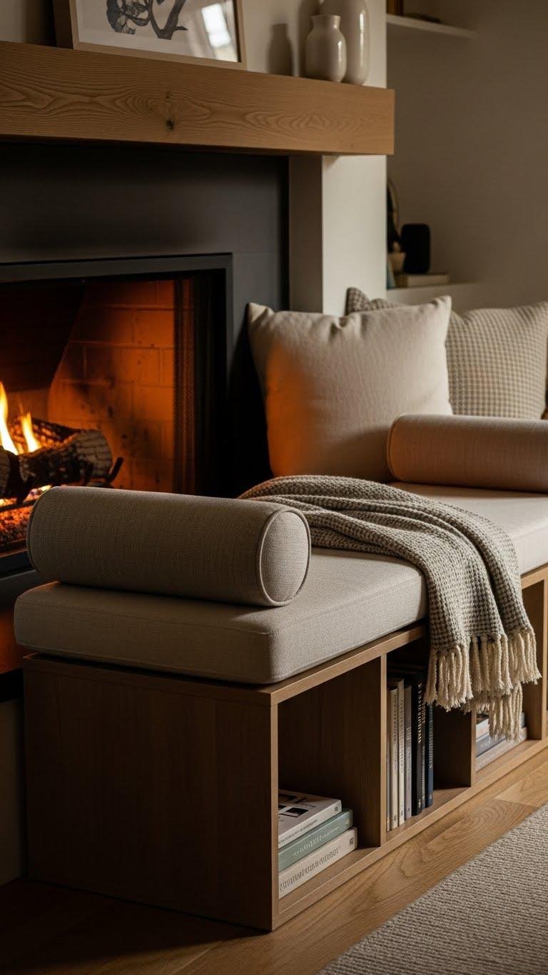 Because a fireplace naturally draws the eye, anchor the hearth with a tailored banquette that invites lingering—choose a low-profile bench with supportive cushioning, scale it to the mantel, and orient seating to face both the flames and the room. Add modular storage beneath for books, layer a simple bolster and throws, and position it as a window seat-hugging hearth nook that feels free and intentional.