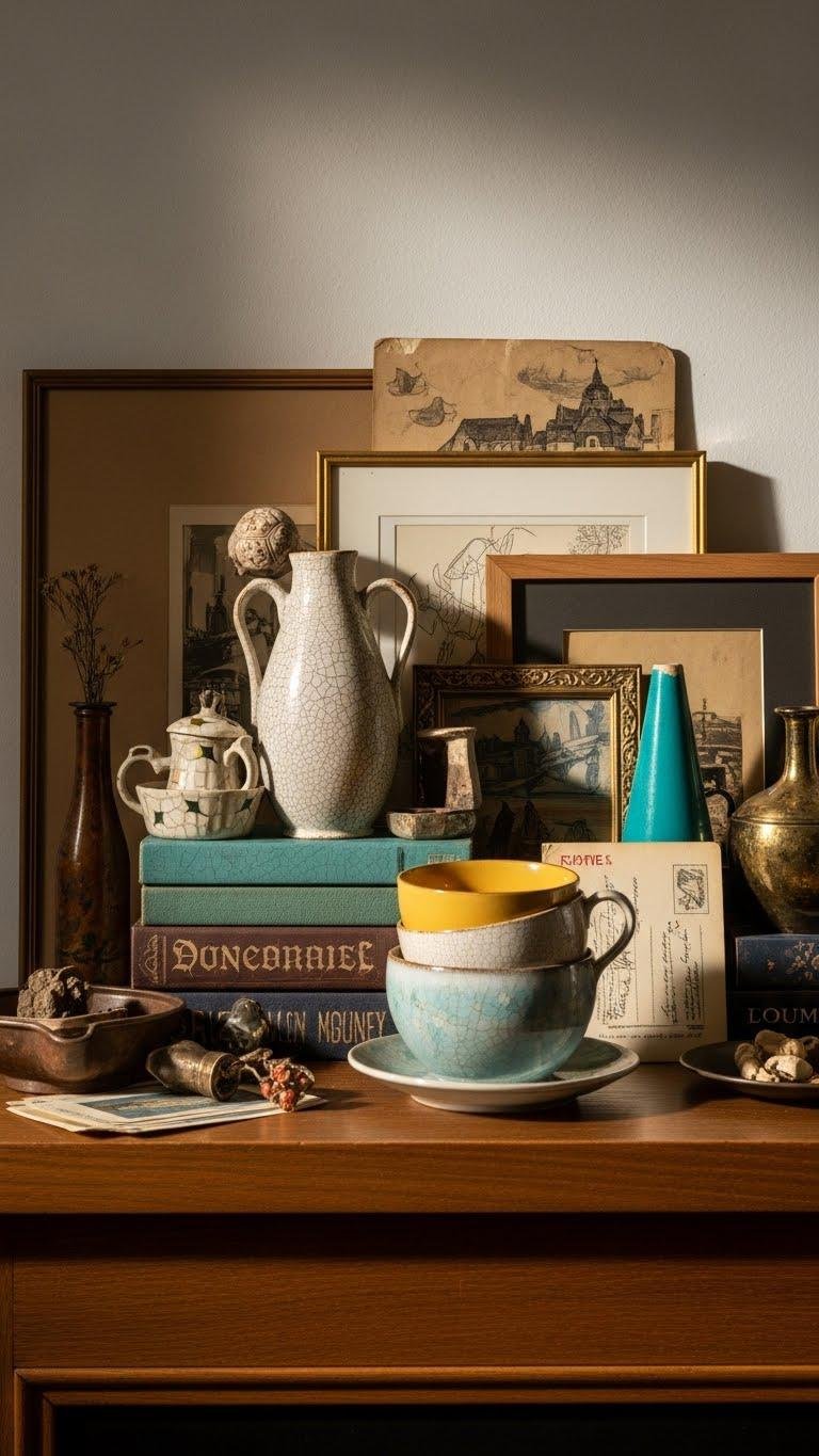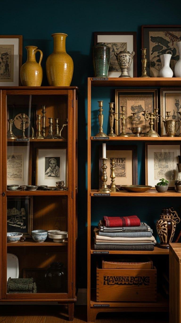 Hunt thrift finds with intent, mix bold colors and textures, and display selectively in curio cabinets or open shelving.