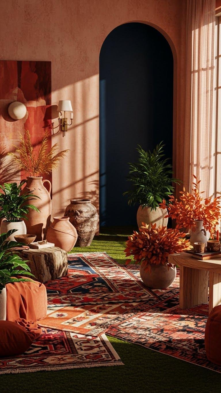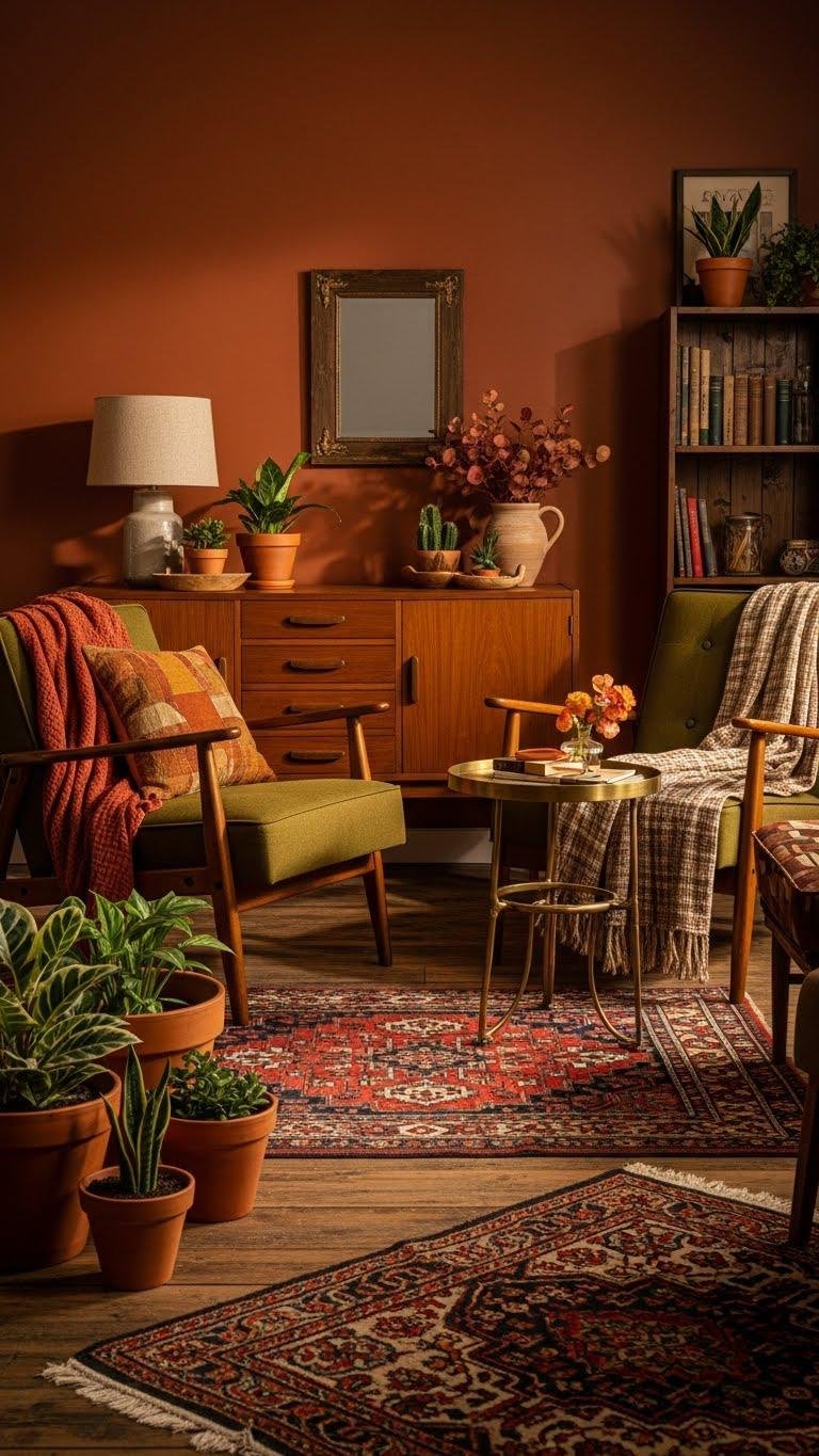 Although you might be tempted to chase trends, trust the pull of warm, earthy tones paired with nostalgic finds to give your space real soul—think terracotta, ochre, olive, and deep caramel grounding a mix of mid-century chairs, thrifted ceramics, and family heirlooms. You’ll layer terra cotta pots, tactile heirloom textiles, brass accents, and bold patterned rugs so your room feels fearless, curated, and utterly lived-in.