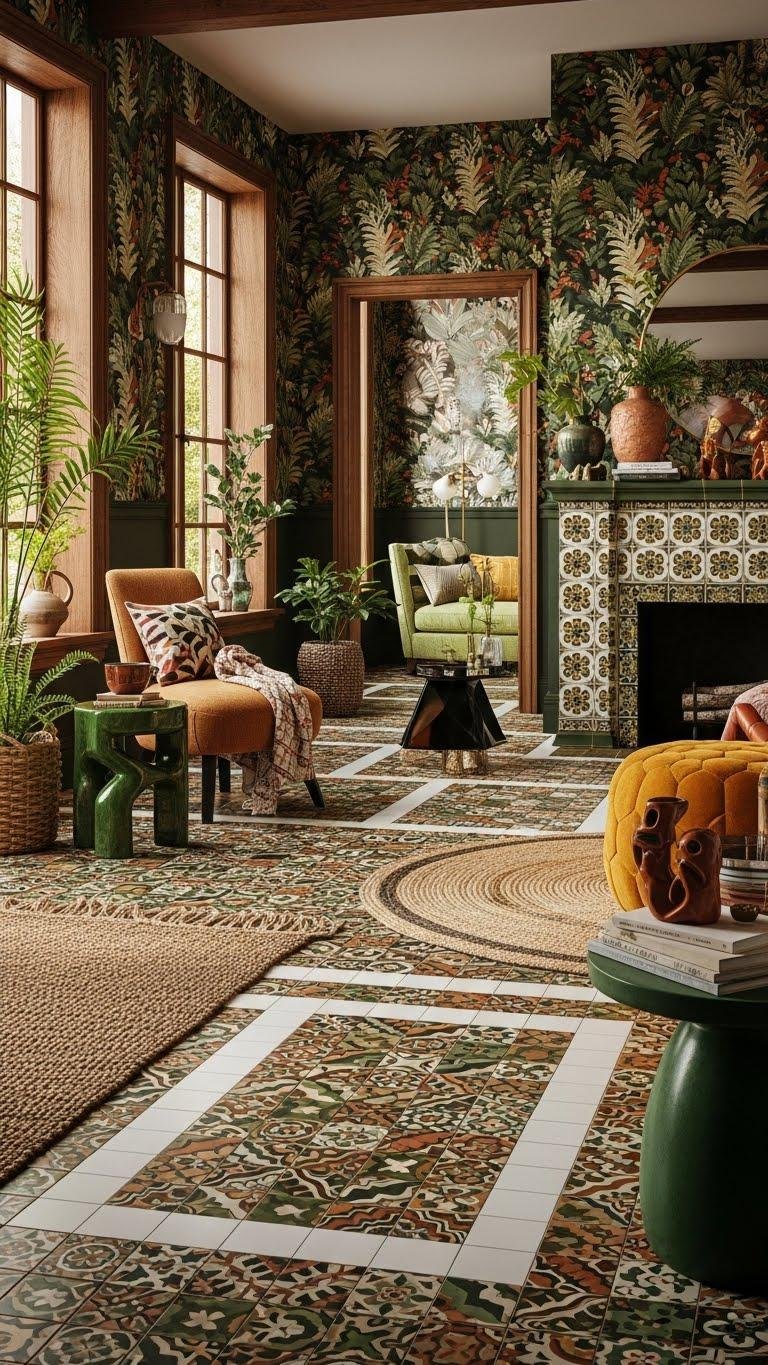 If you want a maximalist room that still breathes, layer bold patterned tile and nature motifs to ground the drama with organic rhythm. You’ll mix botanical tiles with rich grout lines, pairing fern motifs on wallpaper or textiles for movement. Be deliberate: let a tiled fireplace or entryway anchor exuberant colors and sculptural furniture, so the chaos feels chosen, not chaotic.