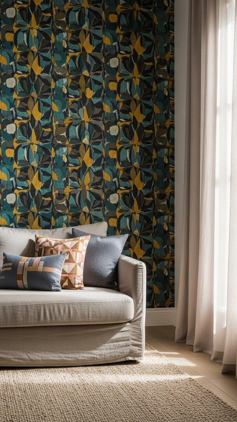Let graphic wallpapers command a single wall while you balance with linen sofas and patterned cushions in restrained palettes.