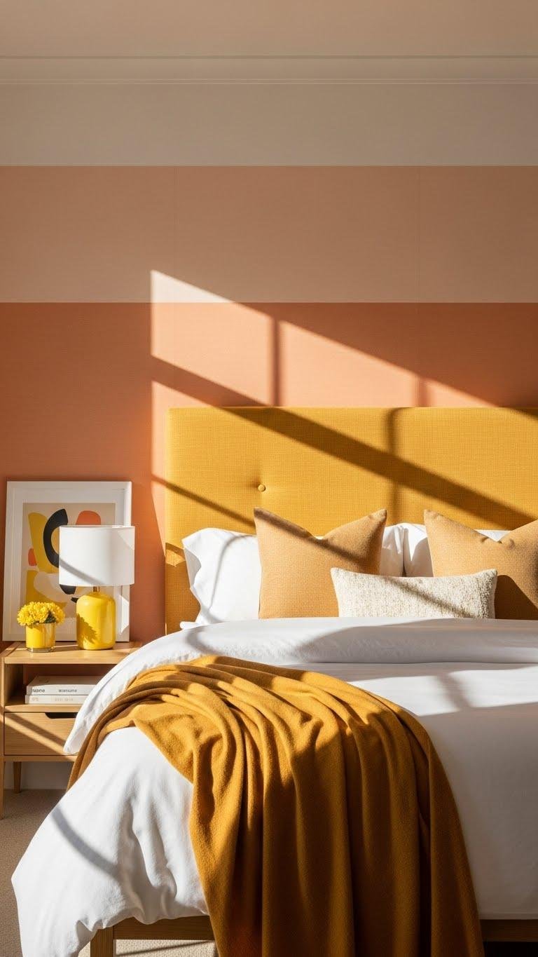 Brighten things up with peach and yellow accents that feel intentional, not saccharine—you want warmth that reads sophisticated, not toddler-chic. Layer peach wallpapers behind a bold headboard, mix matte ochre throws and yellow accents in lamps or art, and choose crisp linens to anchor the palette.
