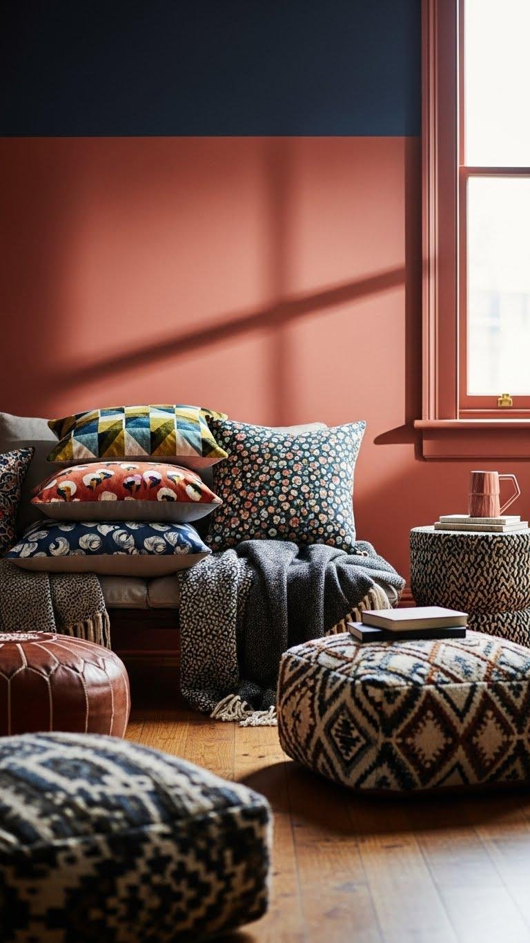 Layer pillows with clashing prints, toss textured throws over arms, and scatter patterned poufs for seating and sculptural impact. You’ll mix scales, fabrics, and colors confidently, creating a liberated, tactile tableau that invites lounging, conversation, and unapologetic self-expression.