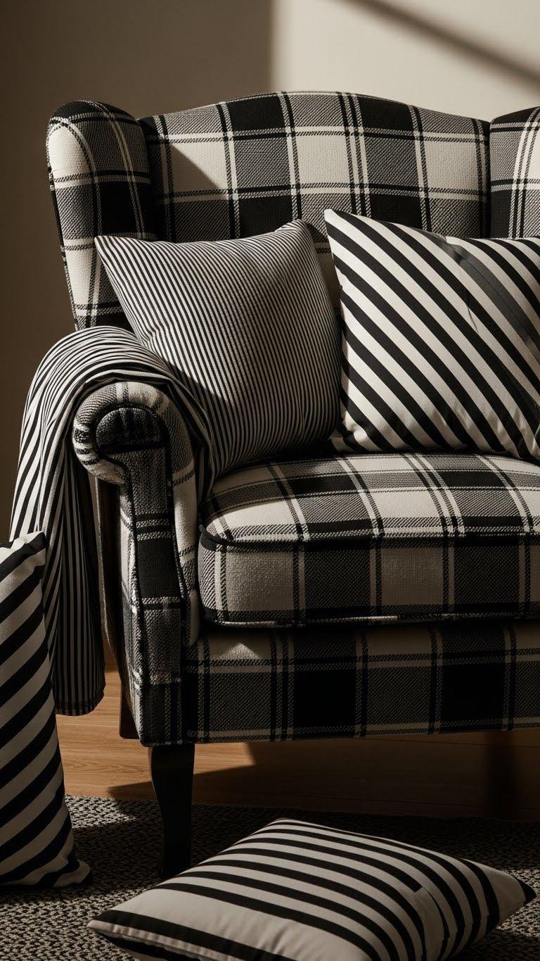 When you mix checks and stripes, don’t treat them like neutral background patterns — let them spar and flirt to create stage-worthy drama. You’ll pair a bold monochrome plaid armchair with diagonal stripeplay cushions, balancing scale and contrast.