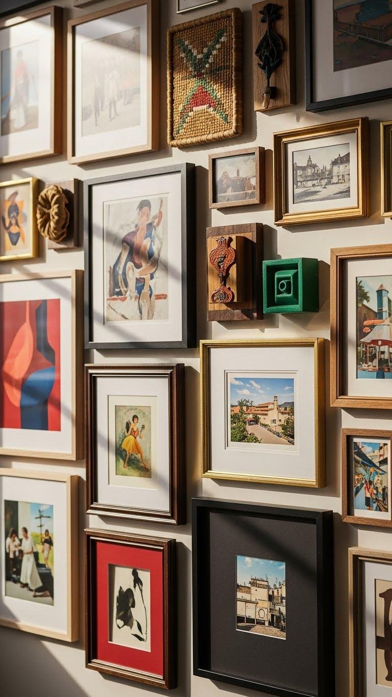 If your plaid-and-stripe moment is all about bold personality, carry that theatrical energy into a gallery wall that reads like a curated passport — local makers, flea-market discoveries, and framed travel snapshots all staged with the same confident eye. You’ll mix pieces by local artists with found objects and travel mementos, arranging varied frames and unexpected spacing to feel free, fierce, and distinctly yours.