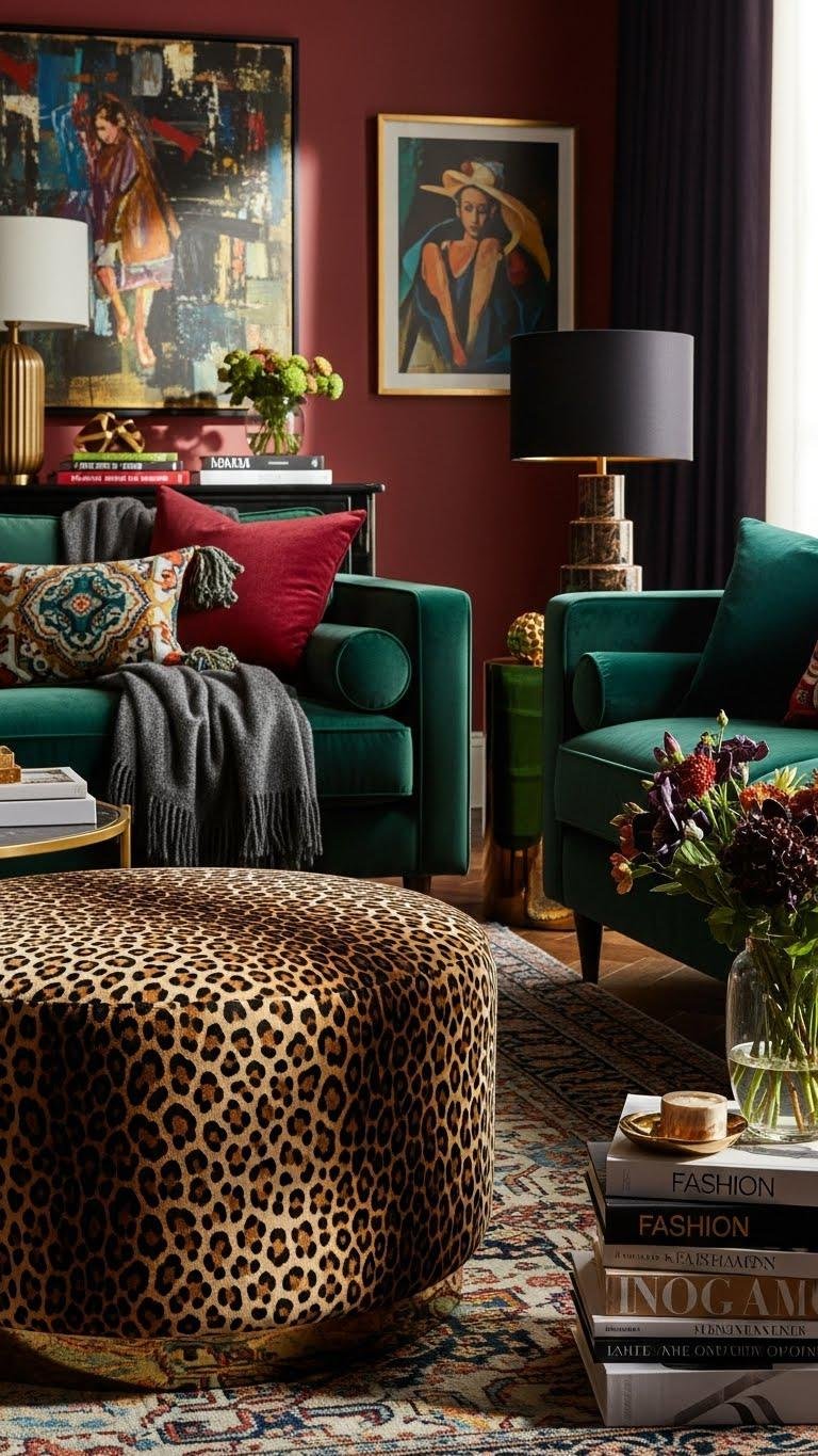 Bring a leopard-print ottoman into the room and let it do the heavy lifting of personality—this small, bold piece punctuates a maximalist scheme with instant glamour and confident edge. You’ll choose bold upholstery to anchor a seating group, mixing animal motifs with saturated color and textured throws. Place it where guests notice first; it’s playful, liberating, and unapologetically you.