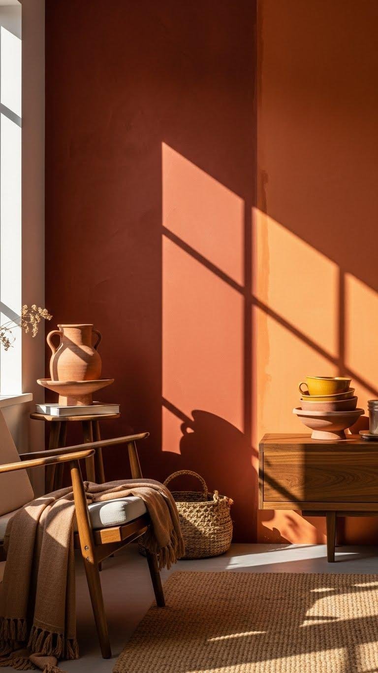 Choose terra cotta for grounded energy, apply russet plaster for texture, use subtle ochre glazing to catch light, or go matte with sienna limewash. You’ll create a luxe backdrop that frees your styling choices.