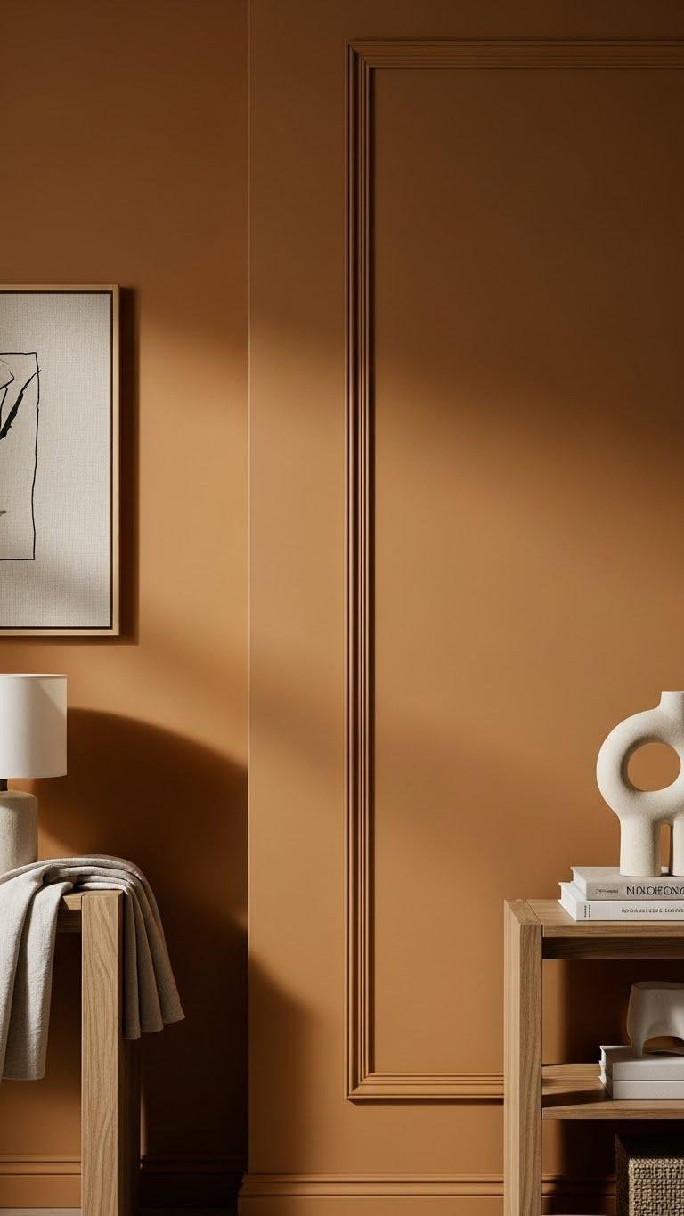 If you’ve anchored a room with an ochre statement wall, accenting its edges with deep umber feature trim heightens the contrast and frames the warmth like a tailored suit.