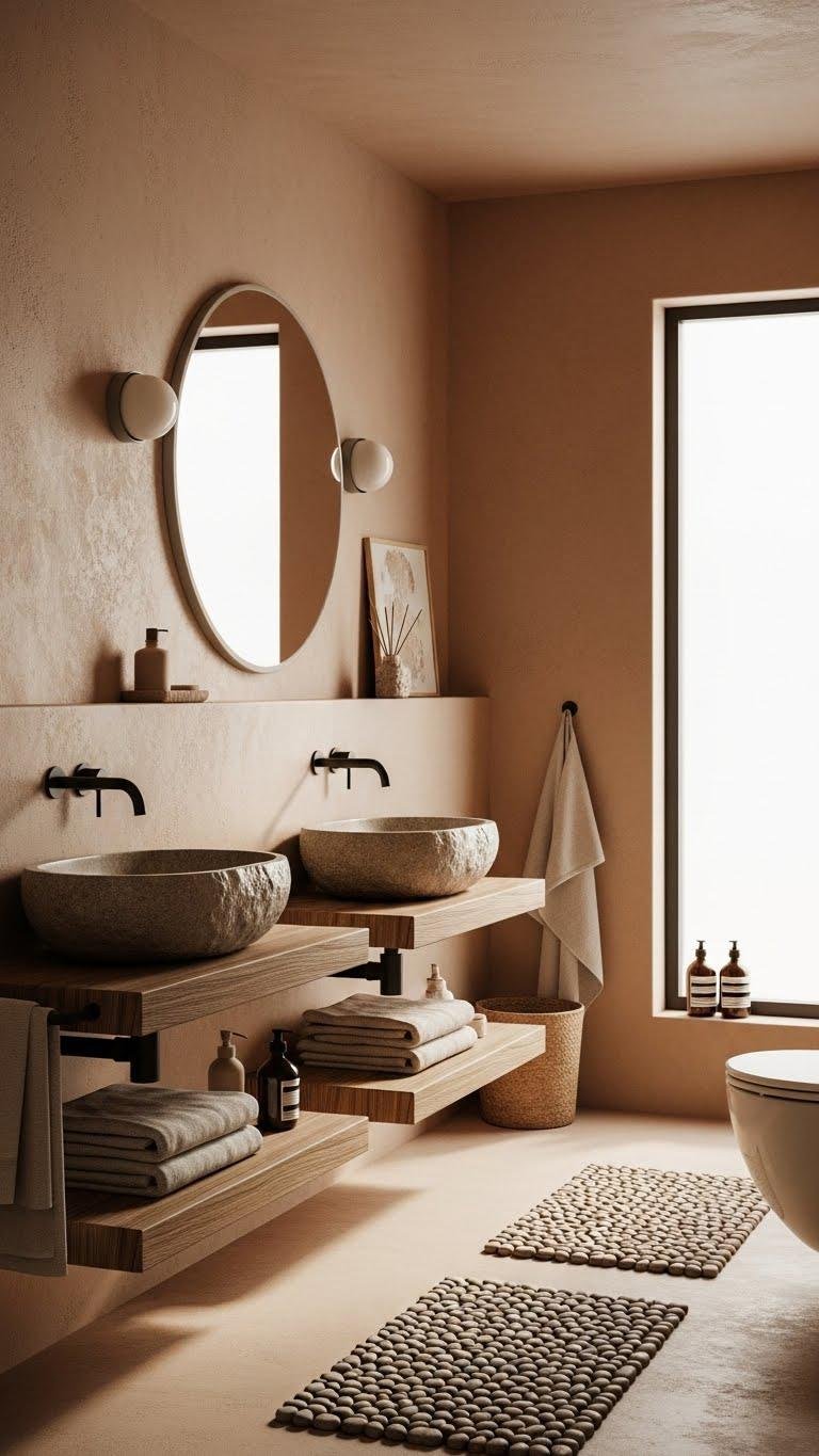 Sink into a soft clay bathroom retreat and let warm, earthy tones reset your senses.
