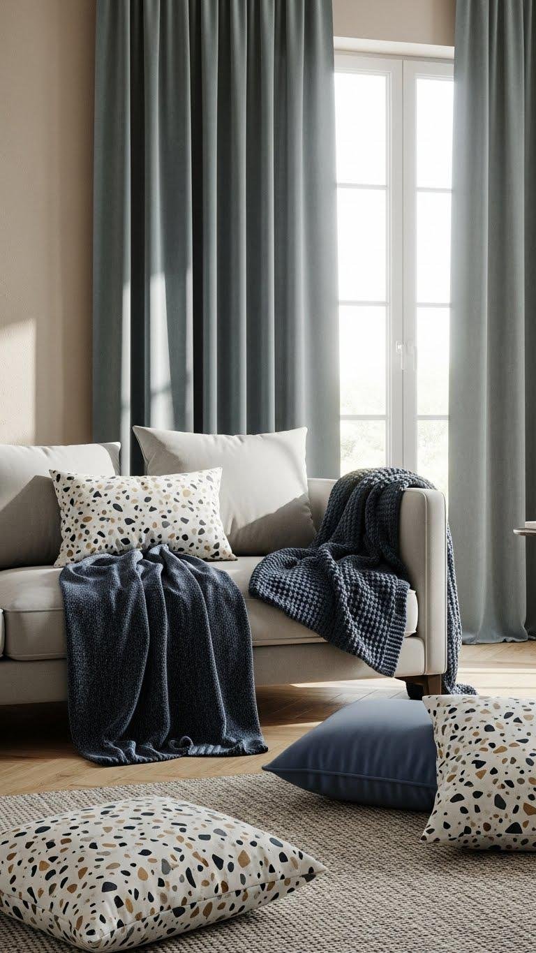 You’ll layer velveteen drapery and coastal indigo throws to add depth without heaviness.