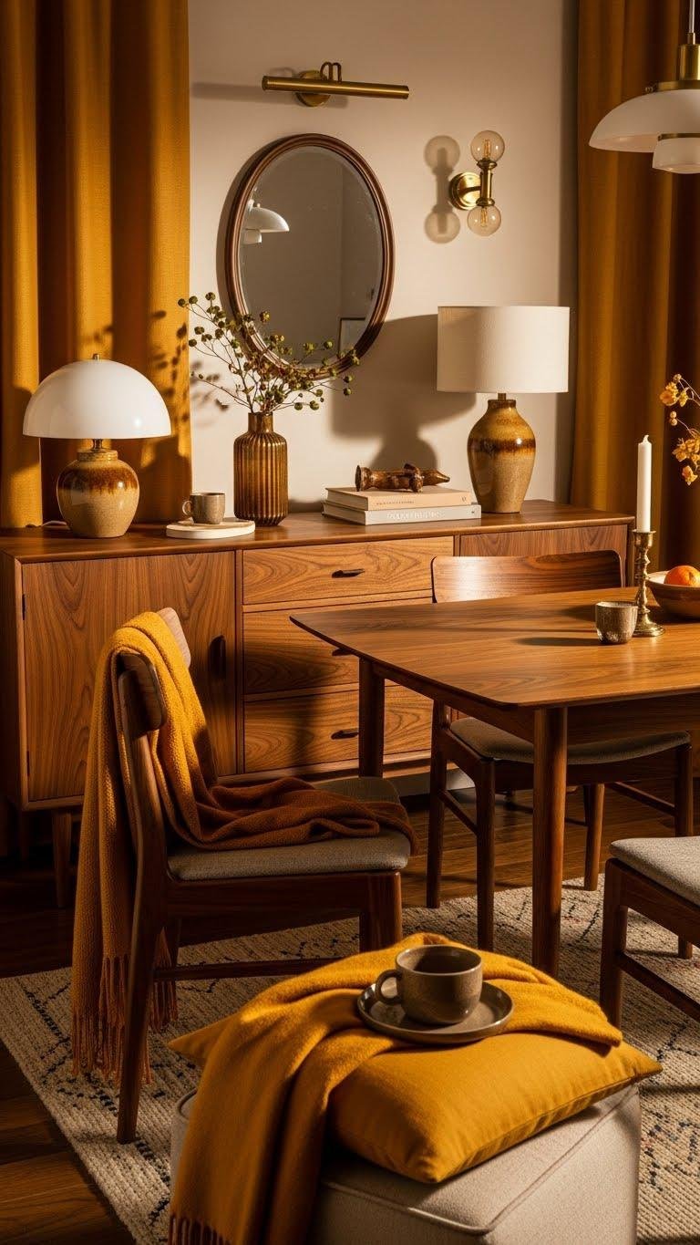 Mustard and walnut make a confident vintage pairing that feels both nostalgic and freshly curated—think deep, honeyed wood tones warming rich, muted golds across a living room or dining nook. You’ll balance walnut furniture with textured linens, layer accents like vintage brasswalkers and ceramic lamps, and drape mustard marigold scarves for color punctuation, creating a liberated, timeless atmosphere that’s stylish without shouting.