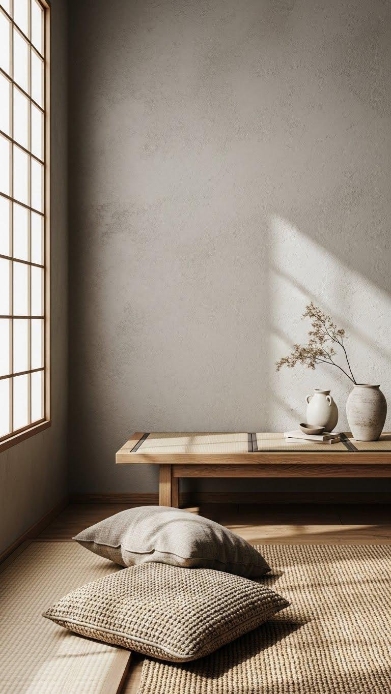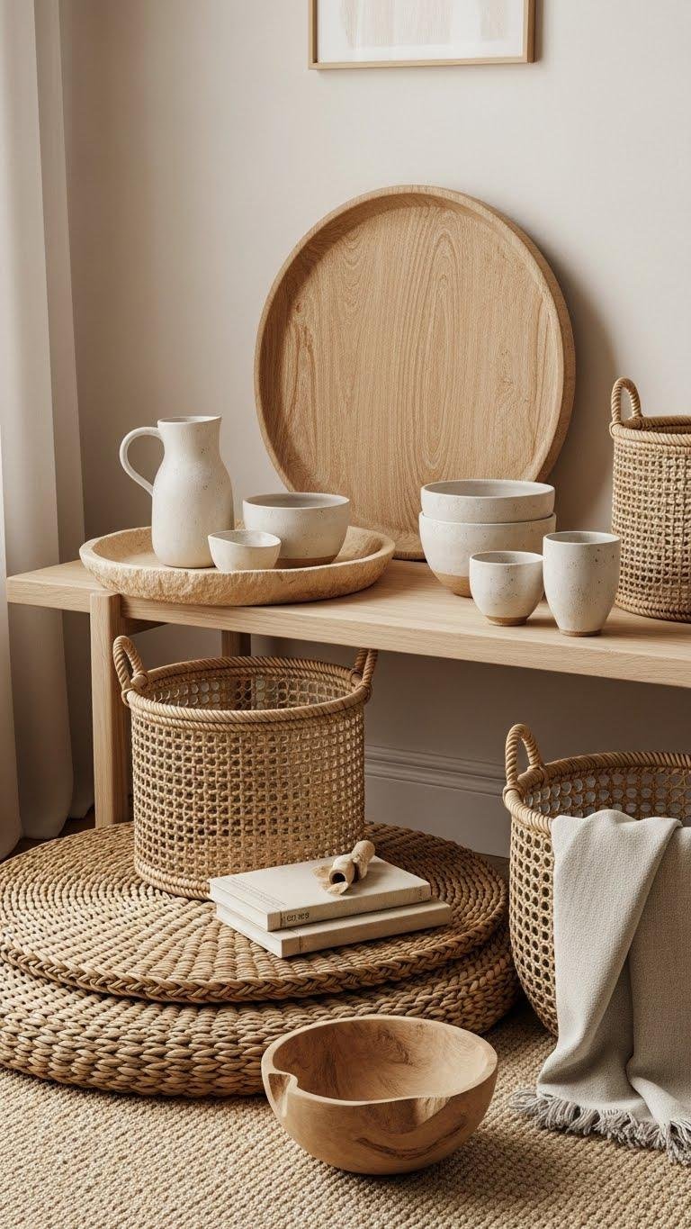 Natural-material accents—rattan baskets, raw-wood trays, and hand-thrown ceramics—bring tactile warmth and honest texture to Japandi Stone and Sand schemes.